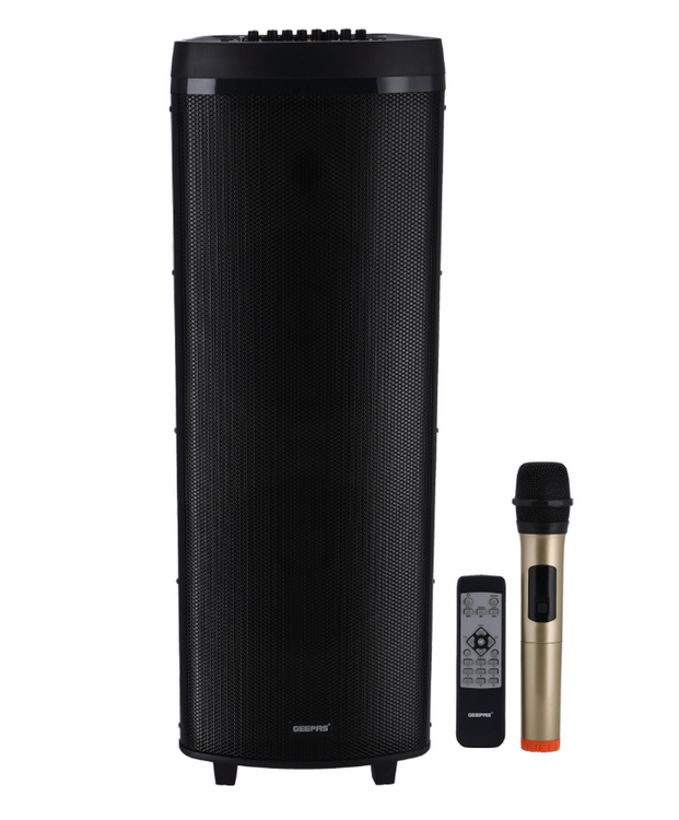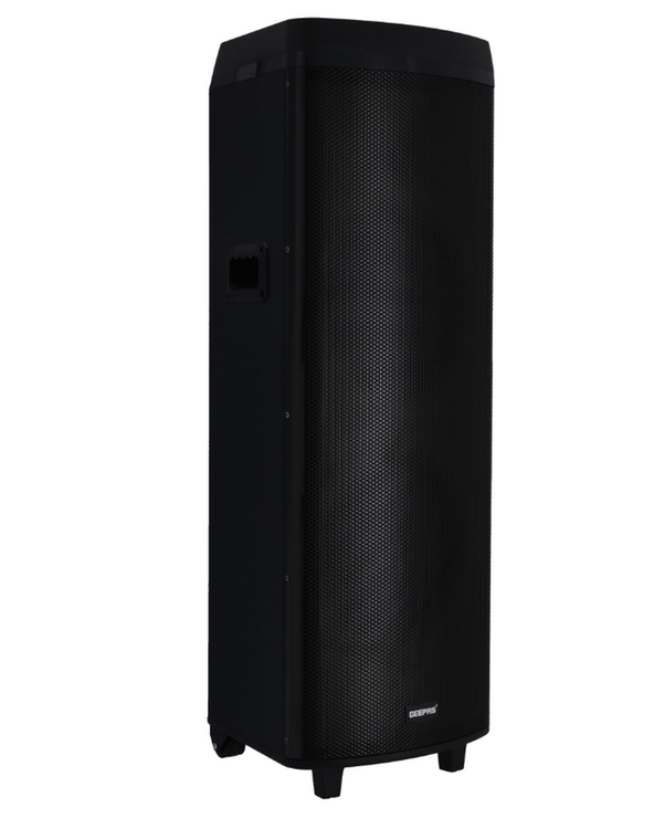 سیستم بلندگوی Hi-Fi Geepas همراه با یک بلندگوی 2*12 اینچی DJ، صفحه جعبه چوبی ذوزنقه ای + گریل فلزی با عملکردهای USB، TF، FM، BT و TWS شامل ورودی Aux/Guitar و MIC 5 افکت صدای مختلف با 6 شعله پویا متفاوت جلوه های نور با سه گانه/باس و میکروفون 80000W PMPO